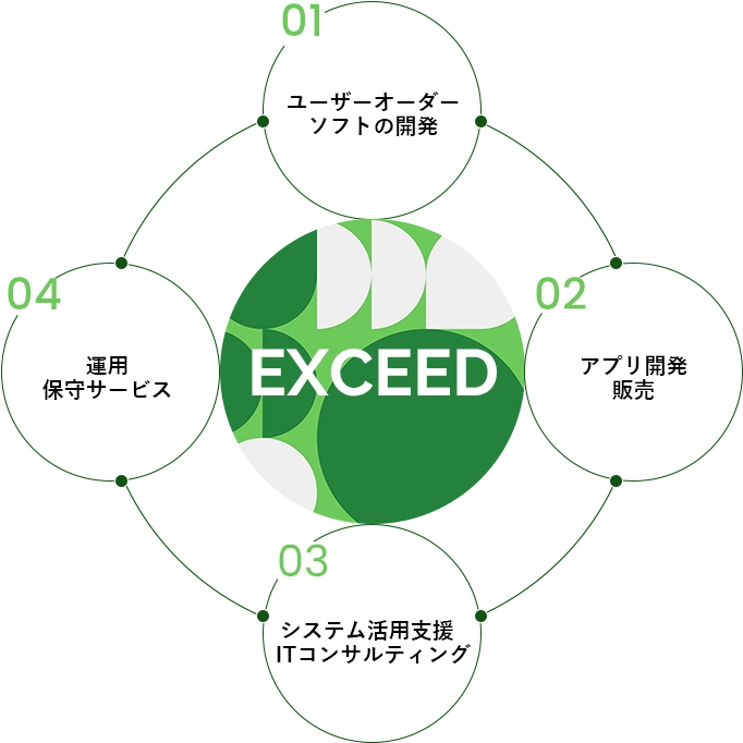 Driven by Technology, Built on Trust. About Us 私たちについて 人の幸せを起点に、ソフトウェアを進化させる。 エクシードのお客様企業は、エンドユーザーの満足を徹底的に追求したり、煩雑な業務を効率化し、従業員のウェルビーイング向上を大切にしている企業です。既存のソフトウェア製品やソリューションだけでは解決できない課題に直面することも多いため、私たちは常に真剣にアイデアを練り、お客様の想いを形にしてきました。時には前例のない挑戦に踏み出すこともあります。しかし、そのプロセスには必ず「働く喜び」と「創る楽しさ」があります。「お客様の満足とウェルビーイングに貢献するためには、まず私たち自身がハッピーであること」。この考え方を体現しながら、エクシードはお客様と共に未来を拓いていきます。 read more Services サービス 現場の課題に寄り添うオーダーメード開発を支援します。 多くの企業が、既存のパッケージシステムで「現場で使いにくい」「大規模なカスタマイズが必要」「コストや工数が膨らむ」といった課題に直面しています。エクシードは、こうした声に向き合い、お客様固有の課題や現場のニーズに寄り添ったソリューションを提供。単にシステムを導入するのではなく、事業に最適なオーダーメード開発を通じて、業務効率化や事業成長を支援します。 read more 01 Custom software development ユーザーオーダーソフトの開発 お客様の現場に寄り添い、求められる機能を確実に形にするソフトウェア開発。 Webアプリケーションを軸に、先進技術を取り入れながら、 幅広い業界での構築実績を着実に増やしています。 02 App development and sales アプリ開発・販売 スマートフォンやタブレット向けのアプリをはじめ、クラウドサービスと連携する自社ブランドのアプリケーションで、お客様の利便性向上をサポートしています。 03 System support and IT consulting システム活用支援 / ITコンサルティング アプリやWebサービスの導入、IT基盤の刷新、従業員の創造力向上、データドリブン型の意思決定など、お客様の経営戦略やIT投資計画に寄り添ったコンサルティングと、情報システムの活用支援を提供しています。 04 Operation and maintenance services 運用・保守サービス お客様のシステムやクラウド環境の運用・保守をトータルにサポートします。日々の運用やトラブル対応でお悩みの際は、ぜひエクシードにご相談ください。 News お知らせ 2025.12.01 コーポレートサイトをリニューアルしました。 2025.12.01 リクルートサイトを公開しました。 recruit site 2025.01.10 新卒採用情報2026年3月 大学・専門学校等卒業予定者向け募集要項を公開しました。 2024.06.26 プライバシーマークの更新認定を受けました。 株式会社エクシードは2024年6月26日付けで一般財団法人日本情報経済社会推進協会(JIPDEC)より、個人情報の適切な取り扱いをおこなう事業者に付与される『プライバシーマーク』の更新認定を受けました。 Join Us to Shape the Future Together. 採用情報 Recruit エクシードでは、一緒に働く仲間を募集しています。エンジニアにご興味のある方は、ぜひご覧ください! recruit site Contact お問い合わせ 当社についてのご相談、ご質問などお気軽にお問い合わせください。 お問い合わせ 042-328-6700 受付時間 9:00~17:30(平日)