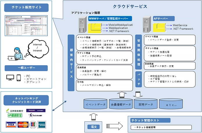 このシステムでは、お客様がPCやスマートフォンからイベント情報の検索・表示を簡単に行い 、チケットの予約申込と、クレジットカードやネットバンキングによる決済が可能です 。