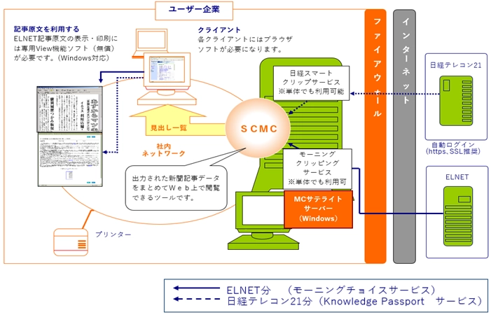 サテライトサーバーに予め転送してある記事原文イメージを社内ネットワーク経由でクライアント端末に提供し、著作権保護に配慮した専用View機能ソフトでのみ閲覧・印刷可能です。